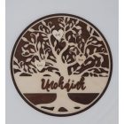 Rétegelt lemezből kivágott és pácolt életfa, szívecskékkel, amelyekre az unokák neve kerül gravírozásra